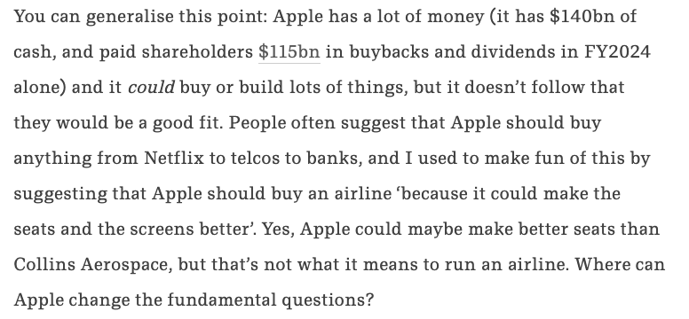 Most companies are limited by money to take on TAM expansions but the best examples to study are those who have the cash and the discipline in deploying it. Benedict Evans provided a glimpse of this in a recent article about Apple that is worth reading.