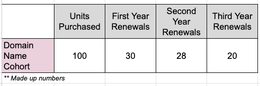 About a decade back, I was at a company where our primary product was domain names. Domain names are bought as an annual subscription with the first renewal at the end of the first year.